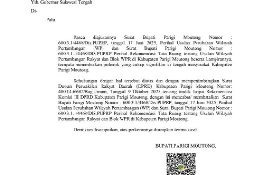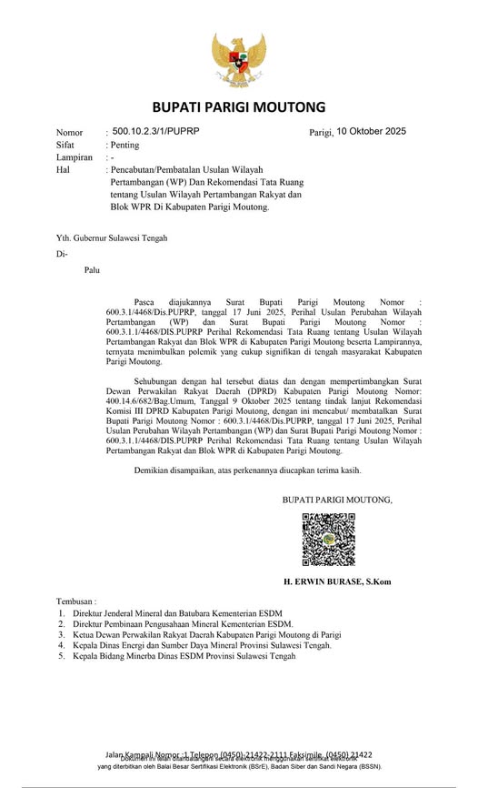 “Pasca diajukannya surat usulan tersebut, ternyata menimbulkan polemik yang cukup signifikan di tengah masyarakat Kabupaten Parigi Moutong,” ujar Bupati Erwin Burase dalam surat tersebut, 11 Oktober 2025.