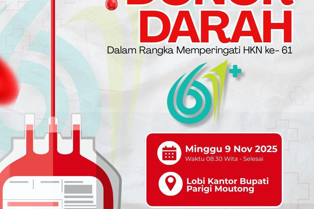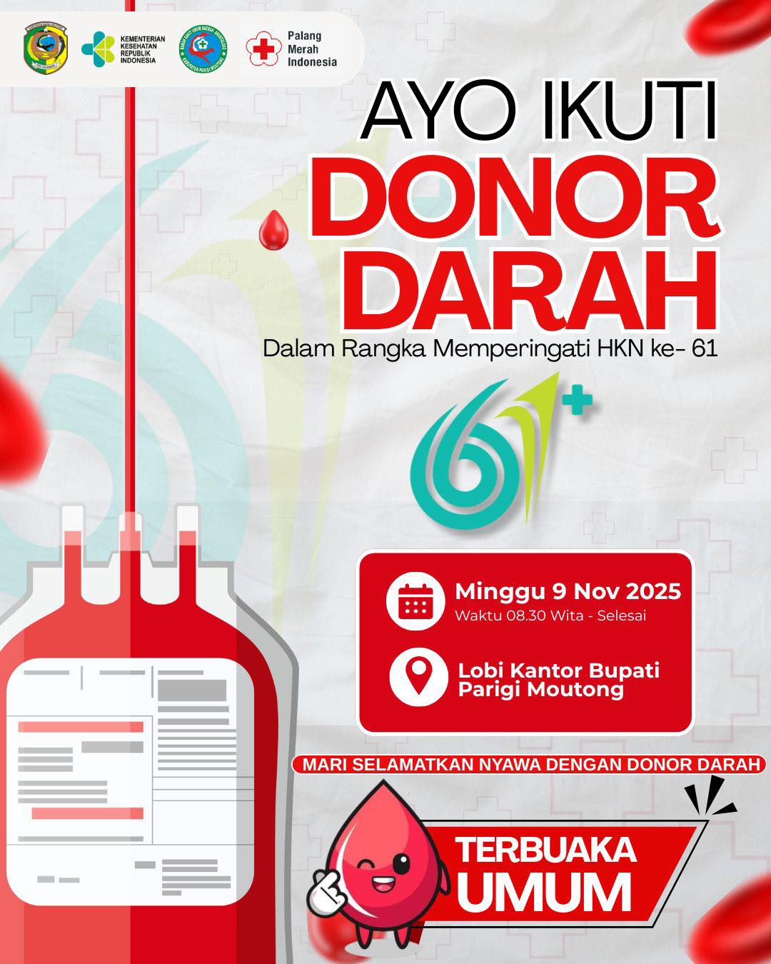 PARIGI MOUTONG, DIALOGIS.ID – Dalam rangka memperingati Hari Kesehatan Nasional (HKN) ke-61, Pemerintah Kabupaten Parigi Moutong bersama Palang Merah Indonesia (PMI) menggelar kegiatan donor darah yang terbuka untuk seluruh masyarakat. Kegiatan kemanusiaan ini akan berlangsung pada Minggu, 9 November 2025, mulai pukul 08.30 WITA hingga selesai, bertempat di Lobi Kantor Bupati Parigi Moutong.